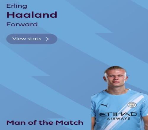 梅开二度,哈兰德当选水晶宫vs曼城全场最佳球员